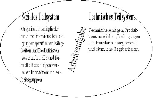 Zum technischen Teilsystem gehören die technischen Anlagen, die Produktionsmaterialien, die technischen Bedingungen der Transformationsprozesse und die räumlichen Gegebenheiten. Bestandteile des sozialen Teilsystems sind die Organisationsmitglieder mit ihren individuellen und gruppenspezifi-schen Fähigkeiten und Bedürfnissen sowie formelle und informelle Beziehungen zwischen Individuen und Arbeitsgruppen. Die Arbeitsaufgabe ist das Verbindungsglied zwischen technischem und sozialem Teilsystem und daher Ansatzpunkt der Arbeitsgestaltung im Rahmen der soziotechnischen Systemgestaltung (Primat der Aufgabe). Das Konzept der soziotechnischen Systemgestaltung richtet sich insofern gegen technologischen Determinismus (Systemzwänge), als es das soziale Teilsystem als autonomen Bestandteil eines primären Arbeitssystems betrachtet. Diese Sichtweise führte dazu, daß einer den Fähigkeiten und Bedürfnissen des Menschen entsprechende Gestaltung der Interaktion mit der Maschine und teilautonomen Arbeitsgruppen Beachtung geschenkt wird.