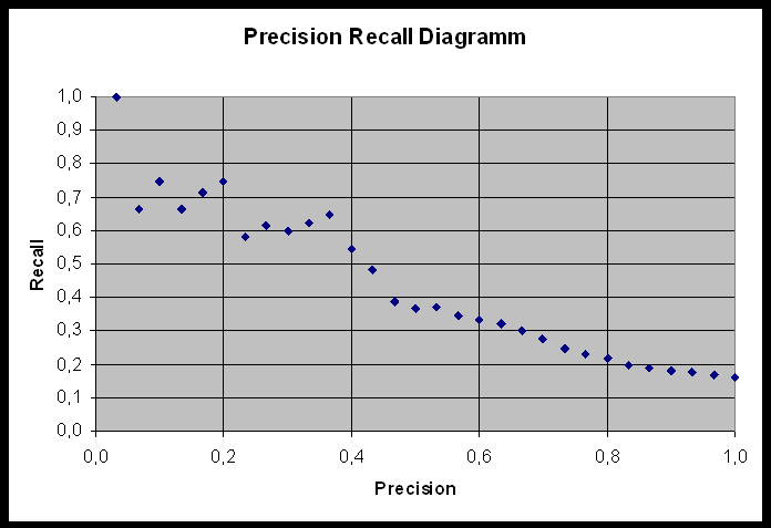 Abbildung 3 zeigt ein sogenanntes Precision Recall Diagramm. Das Diagramm liegt nicht der Tabelle aus Abbildung 2 zugrunde. Es werden dabei Paare von zusammengehörenden Recall- und Precisionwerten aufgetragen. Auch hier wird sehr schön die inverse Beziehung dieser beiden Maße sichtbar. Steigender Recall führt zu sinkender Precision und umgekehrt.