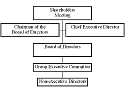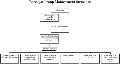 To avoid a too powerful position of the Chairman of the Board of Directors, Barclays defines the Group Executive Committee headed with the Chief Executive Director. The Management Structure of Barclays is principally as described on chart 2. However, the structure is more complicated and difficult to understand even for the managers in my branch. Just to give an idea of the practical structure.